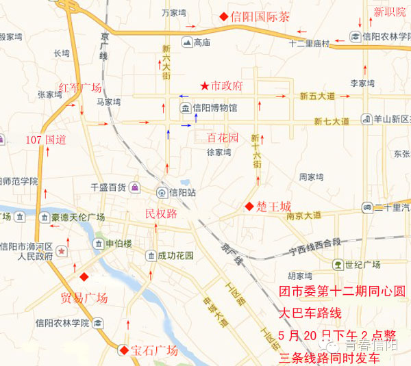 2、宝石广场→电力职工小区→民桥→民权路→东风路口→火车站→铁路医院(第一人民医院)→新七大道→行政审批中心→新十街→博物馆(图书馆)→新五路→新六大街→ 北环路→信阳国际茶城。