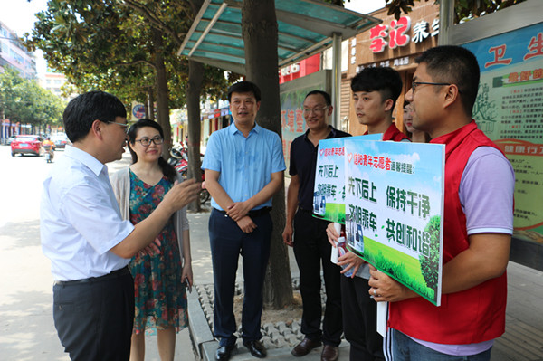 7月21日上午,团市委书记谷光亚、副书记刘伟来到公交站点,亲切看望了炎炎烈日下坚守岗位的志愿者们。谷书记对他们无私奉献的精神和实际行动给予了高度赞扬,他指出,“城市是我家,文明建设靠大家”,希望通过开展“倡导文明行车、助力文明交通”活动,去带动更多的市民,自觉为信阳文明建设加一把劲、出一份力,共创美好和谐信阳。同时,也希望广大志愿们再接再厉,圆满完成服务“一建一创”集中行动的各项活动任务,为“一建一创”贡献青春力量。
