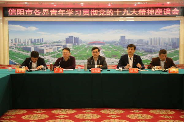 凝心聚力写辉煌,复兴伟业书华章。10月26日下午,信阳各界青年学习贯彻党的十九大精神座谈会在市行政中心二楼召开。团市委书记、市青联主席谷光亚,团市委副书记、市青联副主席卢涛,团市委副调研员、市青联副主席郝松,市青联副主席、新县茅屋冲家庭农场农场主岑新顺出席会议。会议由团信阳市委副书记、市青联副主席、市少工委主任刘伟主持。 团市委常委,团市委委员,市青联常委、委员代表,基层一线青年代表、青年社会组织代表、少先队辅导员代表、中学团委书记代表、乡镇及市直团干部代表,高校青年学子代表共计100余人参加会议。