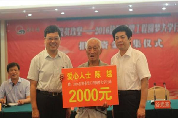 8月10日下午,“365体育在线中文网助力脱贫攻坚--2016希望工程圆梦大学行动”资金募集仪式在信阳市行政中心6号楼举行。信阳市政府副市长谢天学,团市委书记谷光亚,团市委副处级纪检员刘伟,爱心企业、爱心团体和爱心人士及受助大学新生代表共计100余人参加了活动。