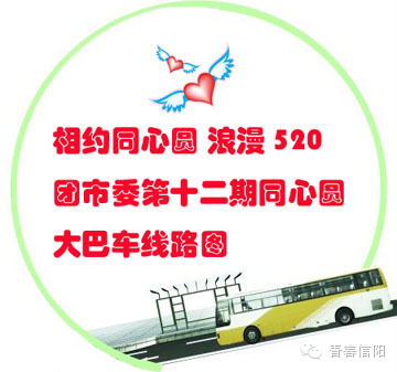 大巴车为同心圆活动专用接送车,有显著标识,车头有:“相亲活动免费乘车”横幅,车侧边:“相约同心圆 浪漫520”横幅。