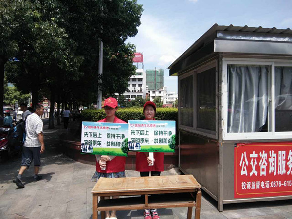 火红的七月,火红的青春。活动中,志愿者们充分发扬奉献、友爱、互助、进步的志愿者服务精神,不畏炎热,吃苦耐劳,每次公交车驶来,志愿者们便高举宣传牌,礼貌提醒乘客注意安全,主动引导乘客有序上下车,及时为行动不便的老幼病残孕提供帮助,并对乱扔杂物、随地吐痰等不文明行为进行劝阻。