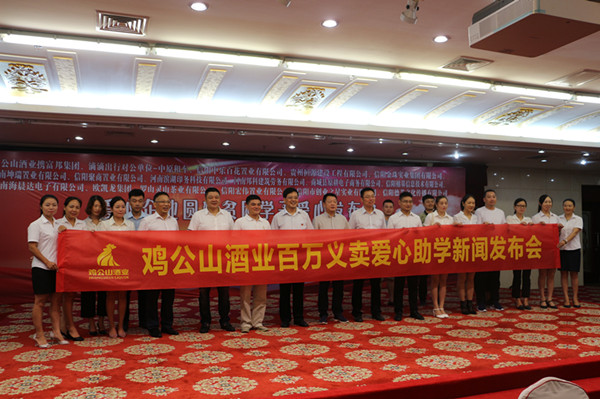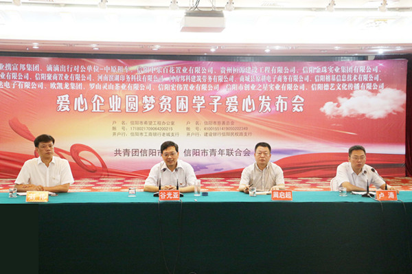 青春孕育梦想,爱心点燃希望!8月17日,共青团信阳市委会同鸡公山酒业、富邦集团、滴滴出行对公单位--中原租车、信阳中乐百花置业有限公司、贵州桓源建设工程有限公司等十八家爱心企业,共同参加了在信阳市政府六号楼举办的鸡公山酒业携手爱心企业圆梦贫困学子百万义卖爱心发布会。