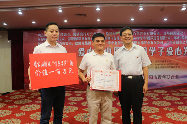 据悉,为了帮助这些孩子们实现人生梦想,共青团信阳市委积极倡议和组织此次活动,得到了全社会爱心团体、爱心企业和爱心人士的大力支持, 鸡公山酒业为此次活动提供了价值百万元的“鸡公山名片”酒用于义卖活动,在发布会现场,共有17家爱心企业参与认购,金额总计82.1万元。此外,还有一些爱心人士匿名参加了此次义卖活动。本次活动的所有款项将全部进入市慈善总会的账户,由慈善总会转交团市委用于2017希望工程圆梦助学行动。
