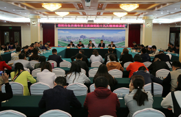 凝心聚力写辉煌,复兴伟业书华章。10月26日下午,信阳各界青年学习贯彻党的十九大精神座谈会在市行政中心二楼召开。团市委书记、市青联主席谷光亚,团市委副书记、市青联副主席卢涛,团市委副调研员、市青联副主席郝松,市青联副主席、新县茅屋冲家庭农场农场主岑新顺出席会议。会议由团信阳市委副书记、市青联副主席、市少工委主任刘伟主持。 团市委常委,团市委委员,市青联常委、委员代表,基层一线青年代表、青年社会组织代表、少先队辅导员代表、中学团委书记代表、乡镇及市直团干部代表,高校青年学子代表共计100余人参加会议。